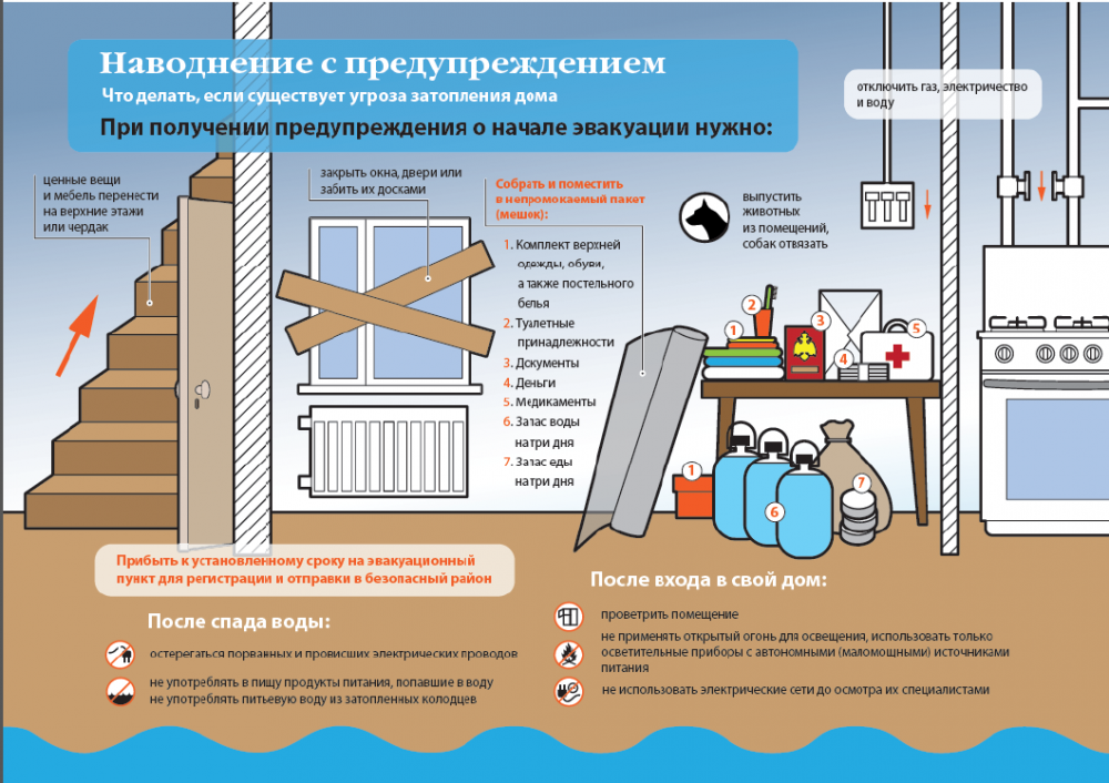 Быстро соберите необходимые документы, ценности, лекарства, продукты и прочие необходимые вещи. Окажите помощь детям, инвалидам и людям преклонного возраста. Они подлежат эвакуации в первую очередь. По возможности немедленно оставьте зону затопления. Перед выходом из дома отключите электро- и газоснабжение, погасите огонь в печах. Закройте окна и двери, если есть время - закройте окна и двери первого этажа досками (щитами). Выпустите домашний скот. Поднимитесь на верхние этажи. Если дом одноэтажный - займите чердачные помещения. До прибытия помощи оставайтесь на верхних этажах, крышах, деревьях или других возвышениях, сигнализируйте спасателям, чтобы они имели возможность быстро вас обнаружить. Для самоэвакуации используйте лодки, катера, плоты из бревен и других подручных материалов. Не следует передвигаться в автомобиле, на мотоцикле, бушующий поток воды способен их опрокинуть. Оказавшись в воде, снимите с себя тяжёлую одежду и обувь, отыщите вблизи предметов, которыми можно воспользоваться до получения помощи. После спада воды остерегайтесь порванных и провисших электрических проводов. Категорически запрещается использовать продукты питания, попавшие в воду, и употреблять воду без соответствующей санитарной проверки. Перед входом в жилище после спада воды соблюдайте меры предосторожности: предварительно откройте двери и окна для проветривания, не пользуйтесь открытым огнем до проветривания (возможна взрывопожароопасная концентрация газов), запрещается включать осветительные и другие электроприборы до проверки исправности электрических сетей.